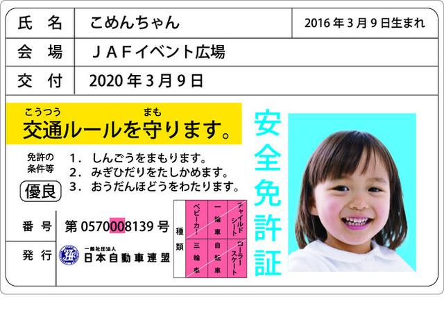 交通安全クイズに挑戦すると、顔写真入りの「子ども安全免許証」を無料で発行します。