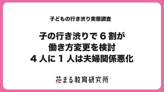調査の結果、子どもの行き渋りをきっかけに、6割の親が働き方の変更を検討していることがわかりました。加えて、約4人に1人の親が夫婦関係の悪化を感じたと回答しており、子どもの行き渋りが保護者の働き方や家庭関係にも影響を及ぼしている実態が明らかになりました。