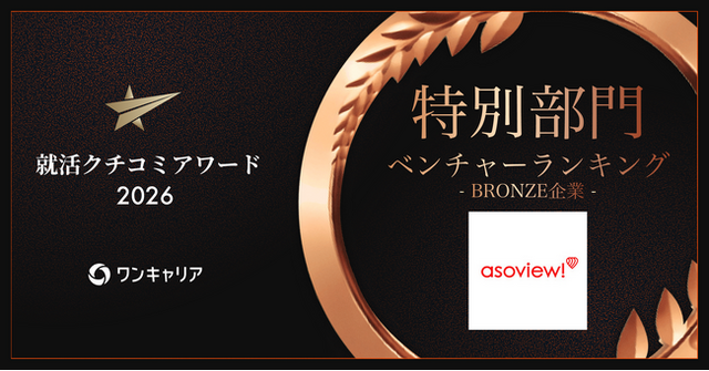 「生きるに、遊びを。」をミッションとし、「遊び」が衣食住に並ぶ人生を彩る豊かなものとして、Well-Beingな社会の実現を目指すアソビュー株式会社(所在地:東京都品川区、代表執行役員CEO:山野智久、以下、当社)は、株式会社ワンキャリアが発表した「ワンキャリア 就活クチコミアワード2026」ベンチャーランキングにおいて、ブロンズ賞を受賞いたしました。