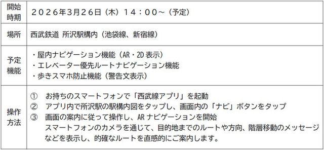 西武鉄道株式会社(本社:埼玉県所沢市、社長:小川 周一郎、以下「西武鉄道」)とアイテック阪急阪神株式会社(本社:大阪市福島区、社長:水本 好信、以下「アイテック阪急阪神」)は、お客さまの利便性向上や、シームレスな移動・暮らし、スマートな事業運営の実現に向けたDX施策の一環として、2026年3月26日(木)から西武鉄道の公式スマートフォンアプリ「西武線アプリ」において、所沢駅構内で利用できるAR※1ナビゲーション機能の技術検証を実施します。