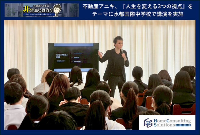 ホームコンサルティングソリューションズ株式会社(本社:愛知県名古屋市、代表取締役:小林大祐)は、YouTubeチャンネル『不動産アニキの非常識な投資学』で情報を発信している弊社代表の小林大祐が2026年3月17日に、大阪府立水都国際中学校・高等学校(大阪府大阪市、校長:太田晃介)にてキャリア形成に関する講演を行いましたのでお知らせいたします。