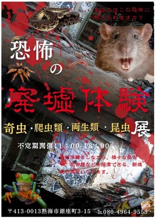 熱海市の古民家物件にて、株式会社トーリーメイト((株)テイクオーバーグループ)は、2026年3月24日(火)より、廃墟を舞台にした新感覚の展示施設「廃墟動物園(熱海 恐怖の廃墟体験 奇虫・爬虫類・両生類・昆虫展)」を不定期開催にて開園いたします 。