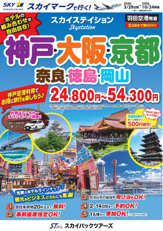 スカイパックツアーズ株式会社(本社:東京都中央区、社長:横山正巳)は、スカイマークを利用した価格固定型のパンフレット旅行商品「スカイステイション 神戸・大阪・京都・奈良・徳島・岡山」【羽田空港発着】(2026年3月29日出発~2026年10月24日帰着)の販売を開始します。スカイマークだけを取り扱う専売店だからできるスペシャルプライス!早めのご予約がお得です。神戸空港を利用して神戸・大阪・京都・奈良・徳島・岡山を満喫♪