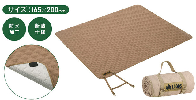 合計12個のステンレス製ウェイトが自重でシートを引っ張るので、綺麗にシートが広がりやすく、風に煽られてもシートを地面に押さえつける。裏面は防水加工を施しているため、湿った地面や濡れた芝生の上でも安心して使用可能。また、アルミ蒸着による断熱仕様で地面からの冷気を遮断するため、肌寒い日のアウトドアや、床が冷たい避難所でも活躍。中綿入りのキルティング生地を使用しているため、座り心地も抜群。
