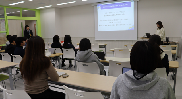 授業の後半では、スクールフォトカメラマンという仕事について、必要なスキルや向いている人物像、仕事のやりがいなどを実際の経験を交えて紹介しました。
