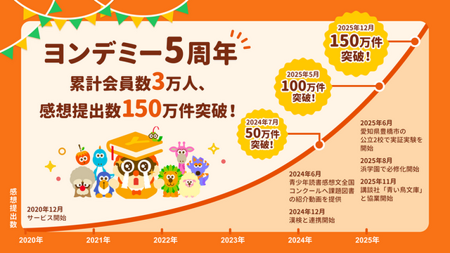 株式会社Yondemy(本社:東京都渋谷区、代表取締役:笹沼 颯太)は、当社が運営する子どもが読書にハマるオンライン習い事「ヨンデミー」において、2025年12月にサービス開始から5周年を迎えるとともに、累計受講者数3万人、感想提出数150万件を突破したことをお知らせいたします。