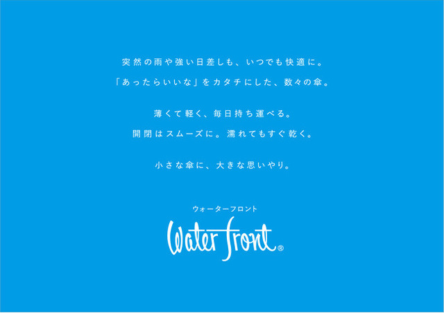 1986年創業の傘ブランドWaterfrontは、累計販売本数2億本を超え、老若男女さまざまなライフスタイルの中でご愛用いただいています。現在まで常に独自の高い機能を追求し、また手頃な価格でお客様の多様なニーズに応えてきました。中でも持ち運びのしやすさに特化した薄型傘「ポケフラット」は累計販売本数2,400万本を超える代表商品です。2022年最高水準の日傘「COKAGE+」、また2023年には、機能性とデザイン性を兼ね備えたレディースブランド「umbulatio(アンブラティオ)」を発表しました。2025年、株式会社ウォーターフロントへ社名を変更、さらに株式会社TSIホールディングスのグループ会社となり、Waterfrontのさらなるブランド価値向上を目指してまいります。