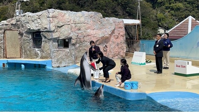 4月1日(水)、下田海中水族館に入社する飼育員3名の入社式を執り行います。この入社式は新入社員の仕事のパートナーとなるイルカから、飼育員の仕事道具の1つとなるホイッスル(動物の訓練で使用する笛)手渡しで進呈するなど水族館ならではの演出を実施します。飼育員になりたいという夢を叶えた新入社員の門出を祝う様子は一般公開いたしますので、ぜひこの機会にお越しください。