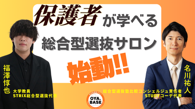 Youtubeチャンネル『保護者が学べる総合型選抜サロンOYA.BASE(オヤベース)』がスタートしました。Studyコーデ代表の名川祐人とSTRIX代表の福澤惇也が中心となり、総合型選抜入試と中心とした大学受験の情報を中高生の保護者の方に向けて発信していきます。さらに保護者だけが参加できる無料のX(旧ツイッター)コミュニティも運営。総合型選抜に関する情報収集がしたい保護者や、悩みを共有したい保護者の方はどなたでも参加することができます。