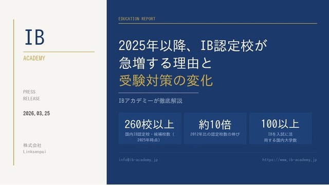 株式会社Linksenpai(所在地:東京都渋谷区、代表取締役:吉田志織)が運営する国際バカロレア専門オンライン家庭教師サービス「IBアカデミー」は、急増するIB認定校と変化する受験環境をテーマに、IB生・保護者向けのオンラインセミナーを実施しました。