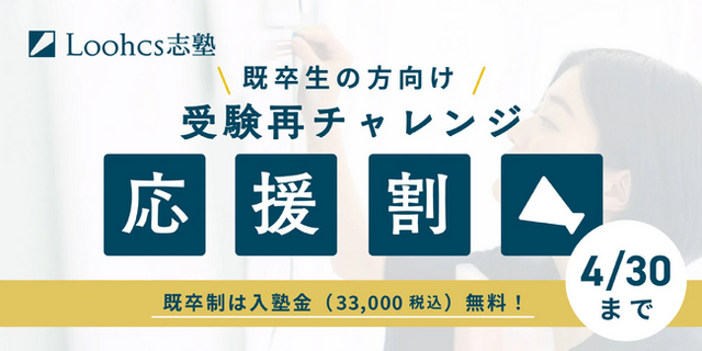 対象者 2026年4月から既卒生となる高校3年生、および現在既卒生として受験に取り組んでいる方優遇内容 入塾金(通常33,000円・税込)を全額無料