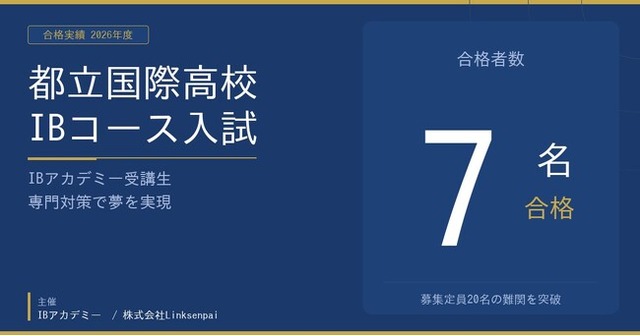 株式会社 Linksenpai(所在地:東京都渋谷区、代表取締役:吉田志織)が運営する国際バカロレア (IB)専門のオンライン家庭教師サービス「IB アカデミー」は、2026 年度の東京都立国際高等学校(以 下、都立国際)国際バカロレアコース(IB コース)入学者選抜において、当塾受講生 7 名の合格を達 成しました。 都立国際の IB コースは募集定員 20 名(4月入学:日本人生徒 15 名・外国人生徒 5 名)という狭き門で、例年 倍率は 4~6 倍に達する東京都内屈指の難関入試です。