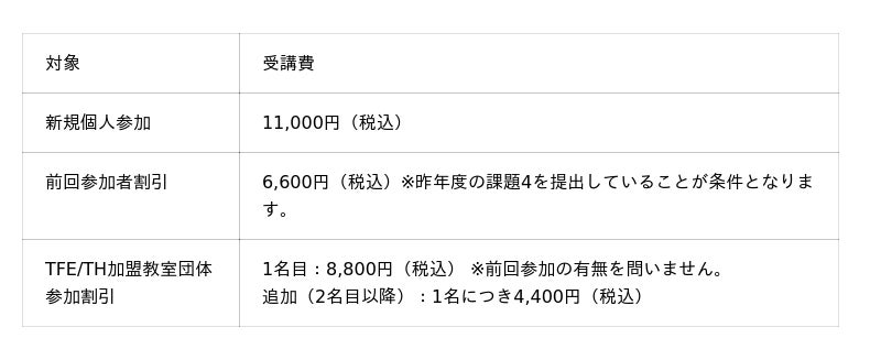 [表1: https://prtimes.jp/data/corp/6960/table/93_1_c8ecf74d0347ca8fc836197a839d15d7.jpg?v=202603301016 ]<受講料と参加対象>