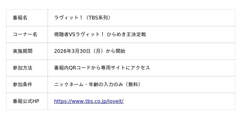 ワンダーファイ株式会社(本社:東京都千代田区、代表取締役:川島 慶)が提供する思考力育成アプリ『シンクシンク』は、本日2026年3月30日(月)より、TBS系列の朝のバラエティ番組「ラヴィット!」のコーナー「視聴者VSラヴィット! ひらめき王決定戦」に思考力問題を提供します。