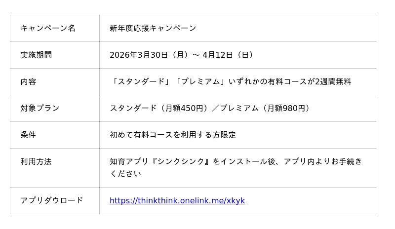 新年度を迎える子どもたちへのエールを込めて、本日より思考力が育つ知育アプリ『シンクシンク』有料コースのトライアル期間を通常1週間から2週間に延長するキャンペーンを実施します。
