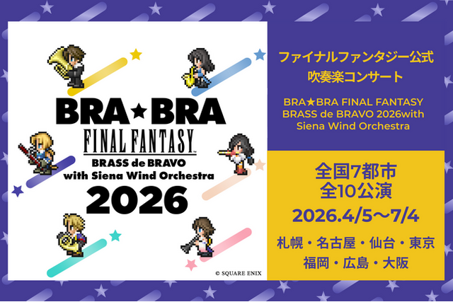 株式会社KOA CREATIVE(本社:東京都中央区銀座、代表取締役:飯島則充)が、サンライズプロモーション、ジャパン・シンフォニック・ウィンズと主催・制作する、 人気ゲーム『FINAL FANTASY』シリーズの音楽をブラスアレンジで楽しむ体験型コンサート「BRA★BRA FINAL FANTASY BRASS de BRAVO 2026 with Siena Wind Orchestra」 が、いよいよ2026年4月5日(日)札幌公演を皮切りに全国8都市(全10公演)を巡るツアーをスタートします。