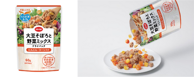 「CO・OP 大豆そぼろと野菜ミックスドライパック」は、そぼろ状にした大豆ミートと彩りの良い野菜をミックスした商品です。大豆たんぱくに加え、野菜も一緒にとることができ、組合員の「家族のために、健康でバランスのいい食事をしたい」という要望にお応えした、たんぱく質を手軽にとれる新商品です。