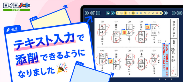 株式会社LoiLoは、授業支援アプリ「ロイロノート・スクール」に、テキスト添削機能を追加しました。提出箱の回答に、テキスト入力で添削ができます。多くの先生方からご要望をいただいていた待望の新機能です。ぜひご活用ください。