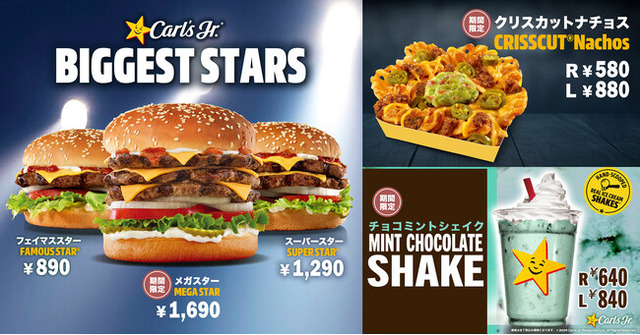 ハンバーガーメニューは、カールスジュニア(R)の人気商品「フェイマススター」が、パティの枚数違いで全3種類から期間限定でお選びいただけます。