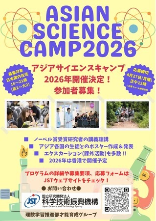 JST(理事長 橋本 和仁)は、2026年8月2日から8月8日に香港で開催される第16回アジアサイエンスキャンプ(ASC2026)への参加者を募集します。募集対象は物理、化学、生物学、数学分野の科学に興味を持つ生徒または学生(高校2年~大学2年相当)です。国内外渡航費や滞在費などの費用は基本的に無料で、参加者負担はありません(パスポート取得費や滞在中の個人的費用等は自己負担)。