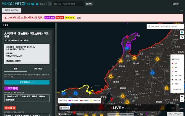 第一弾として本日、津波情報(大津波警報・津波警報・津波注意報)の即時マップ描画と、影響を受ける可能性のある拠点の特定機能をリリースいたしました。