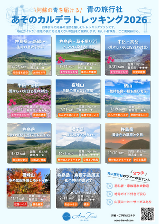2026年4月から12月にかけて、阿蘇の各名峰で多彩なテーマのツアーを実施いたします。- 杵島岳(新緑、ミヤマキリシマ、秋の気配、夕日ハイクなど)