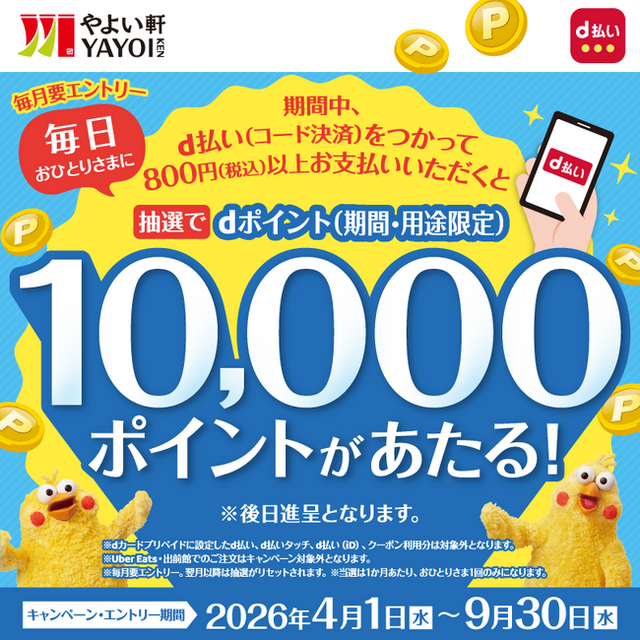 このたび日本国内の「やよい軒」では、d払いをご利用でお得にdポイント(期間・用途限定)をゲットできる『d払い利用でやよい軒にて毎日1名さまに10,000ポイントがあたる!キャンペーン』を実施いたします。