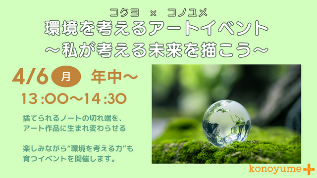 親子向け実践型体験コミュニティー「コノユメPLUS」を運営する株式会社コノユメ(所在地:東京都目黒区、代表:大原 英子)は、コクヨ株式会社と特別コラボレーションし、捨てられるノートの切れ端をアート作品へと再生させ、楽しみながら“環境を考える力”を育む体験型イベントを2026年4月6日(月) 13:00~14:30に開催いたします。