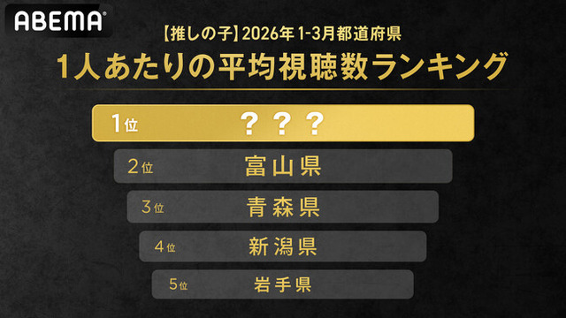 新しい未来のテレビ「ABEMA」は、2026年1月から3月において『【推しの子】』の1人あたりの平均視聴数が最も多い都道府県TOP5を発表いたします。