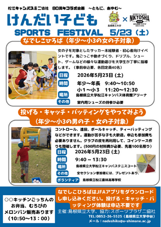 島根県立大学松江キャンパスでは、スポーツプラザ二協社(出雲市)と「"ともに、あゆむ80周年"コラボイベント」として「けんだい子どもSPORTS FESTIVAL」を開催します。子どもたちが目一杯体を動かし、運動が好きになるよう"県大なでしこ地域貢献サークル"の学生が指導者となりサポートします。