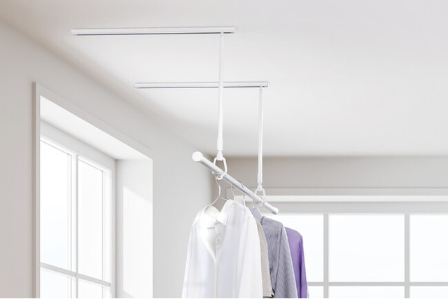 TAR5686は、物干し竿を付けたままレールに沿って壁際へスライド可能。