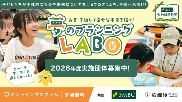 「日本中の放課後を、ゴールデンタイムに。」をミッションに活動する 特定非営利活動法人 放課後NPOアフタースクール(代表理事:平岩 国泰、以下「放課後NPOアフタースクール」)は、株式会社三井住友フィナンシャルグループ(執行役社長グループCEO:中島 達、以下「SMBCグループ」)と協働し、子どもたちが「お金」を通じて未来を考える金融経済教育の体験型プロジェクト「夢のプランニングLABO」を、全国の放課後児童クラブ(学童保育)、放課後子ども教室等の放課後事業団体などで開催します。
