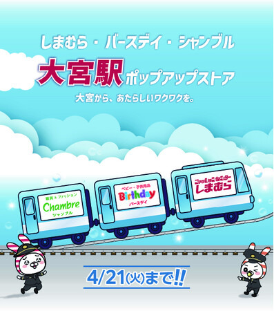 株式会社しまむら(本社所在地:埼玉県さいたま市大宮区北袋町1-602-1、代表取締役:高橋 維一郎)は、 4月 8日(水)より、JR大宮駅にて、ファッションセンターしまむら、ベビー・子供用品バースデイ、雑貨&ファッションシャンブルによる期間限定POP UP STOREを出店いたします。子供服・雑貨を中心に企画を多数ご用意し、皆様のご来店を心よりお待ちしております。