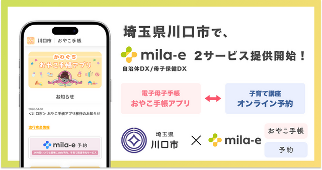 自治体向けサービスを開発する株式会社ミラボ(本社:東京都千代田区、代表取締役:谷川一也、以下「ミラボ」)は、母子手帳アプリ「mila-e(ミライー) おやこ手帳」、オンライン予約サービス「mila-e 予約」の埼玉県 川口市への導入が決定し、2026年4月1日より運用を開始しました。