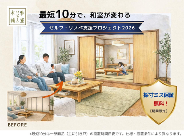 谷元フスマ工飾株式会社(本社:大阪府八尾市、代表:谷元亨)が運営するリフォームブランド「和室リフォーム本舗」は、2026年4月1日(水)より、新生活やゴールデンウィーク(GW)に向けて、自宅のドアや襖を自分で交換できるDIY建具の普及を目的とした「セルフ・リノベ支援プロジェクト2026」を開始します。