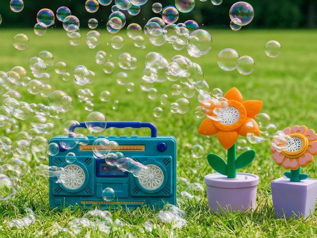 ラジカセデザインや、複数のお花からシャボン玉が出る大容量タイプもラインナップ。自動のタイプは、手が汚れないので便利です。