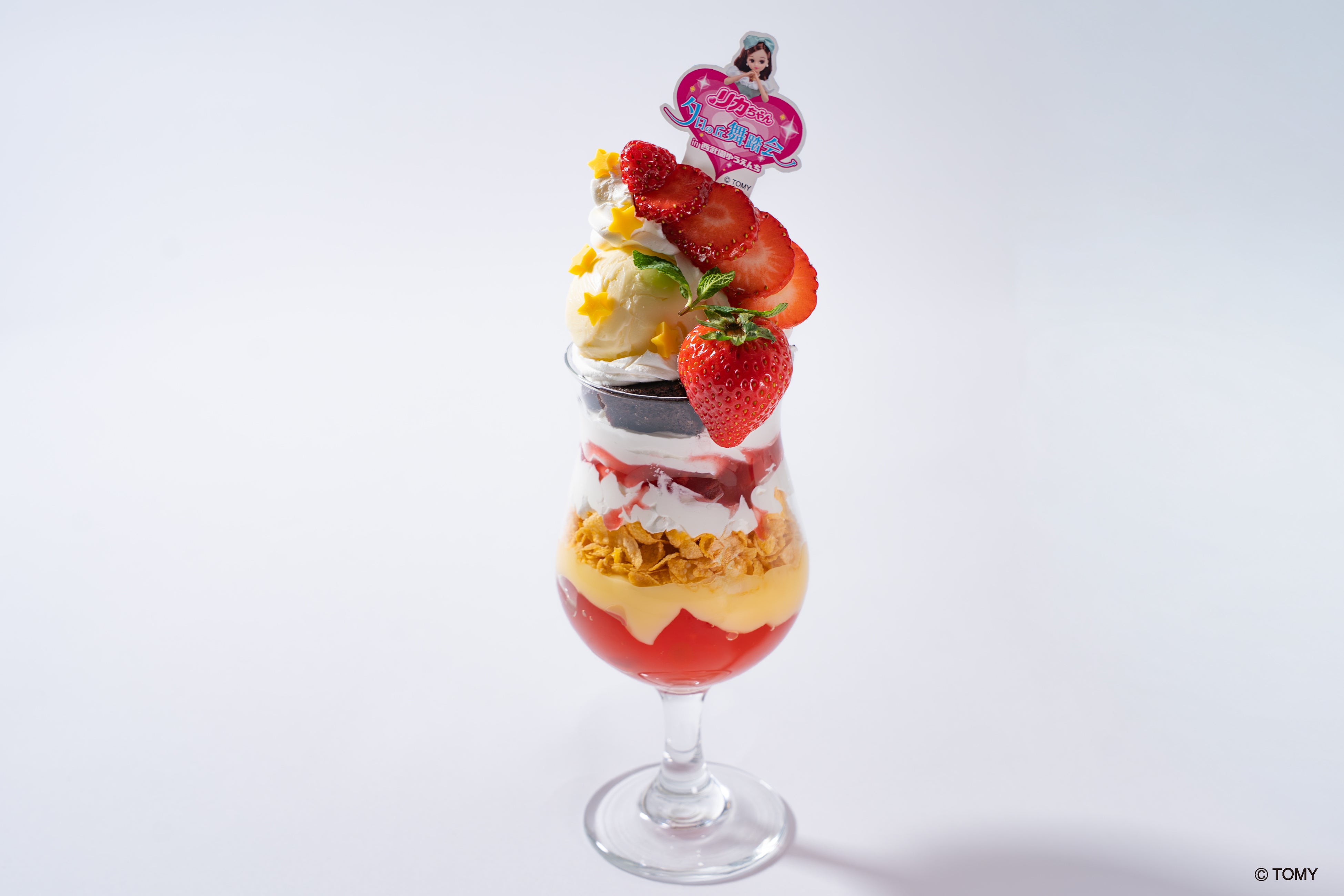 舞踏会の夜をイメージした星がかわいい苺とチョコのリッチな味わいのパフェ。リカちゃんのピック付きでご提供します。
