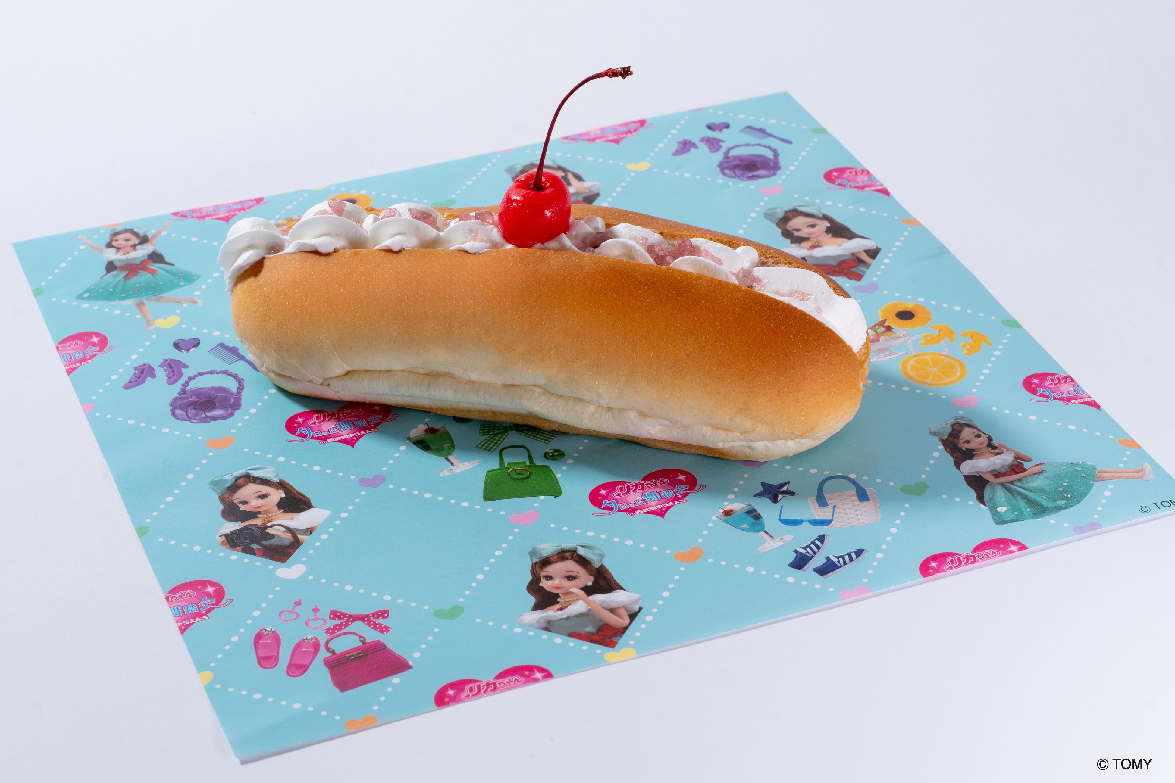まるでソーダの泡のように口の中でぱちぱちと弾けるキャンディーの食感が楽しい、クリイムソーダパンです。オリジナル衣装のモチーフにもなっているサクランボもトッピングしています。