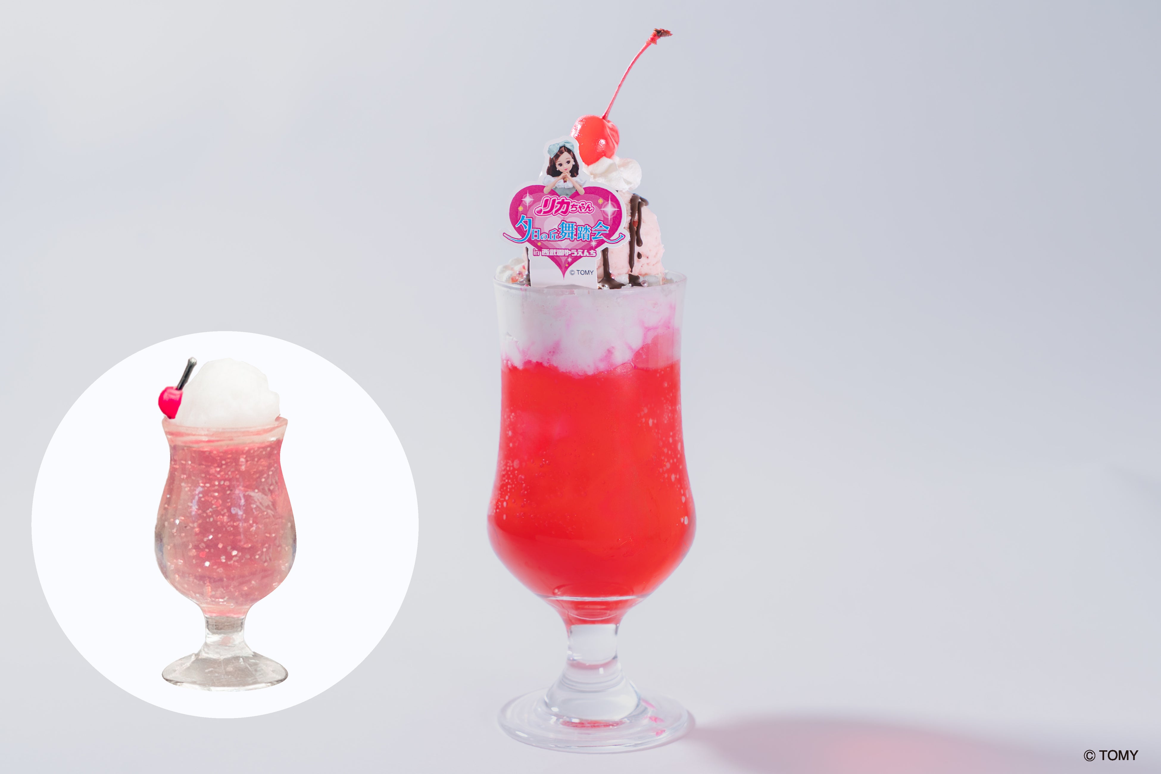 リカちゃんをイメージしたピンク色がとってもかわいい、リカちゃんのピック付きクリイムソーダです。ミニチュアのクリイムソーダ付きなので、小さなお友達と一緒にクリイムソーダをお楽しみいただけます。