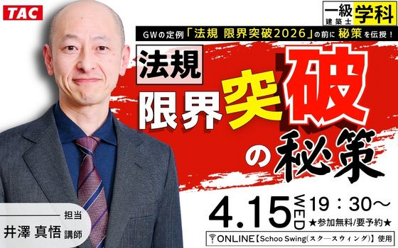 当セミナーでは、GWの前に、法規限界突破、法規一発逆転のための、とっておきの「秘策」=得点アップのための一歩踏み込んだ内容を伝授します!GWには、TAC「法規限界突破」シリーズ「1.法規特訓テスト、2.法改正出題予想講座、3.告示出題予想講座」もご用意していますので、そちらもご検討ください。
