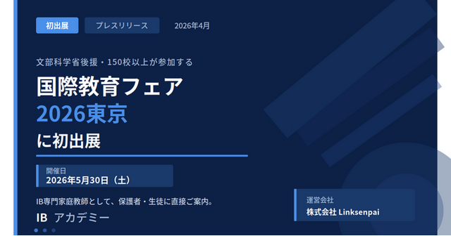 株式会社Linksenpai(所在地:東京都渋谷区、代表取締役:吉田志織)が運営するIB(国際バカロレア)専門オンライン家庭教師サービス「IBアカデミー」は、2026年5月30日(土)に開催される「国際教育フェア2026東京」に初めて出展することをお知らせします。文部科学省後援のもと、国内外150校以上が参加する国際教育の大型イベントにおいて、IB専門家庭教師サービスとして保護者・生徒の皆様に直接サービスをご紹介します。