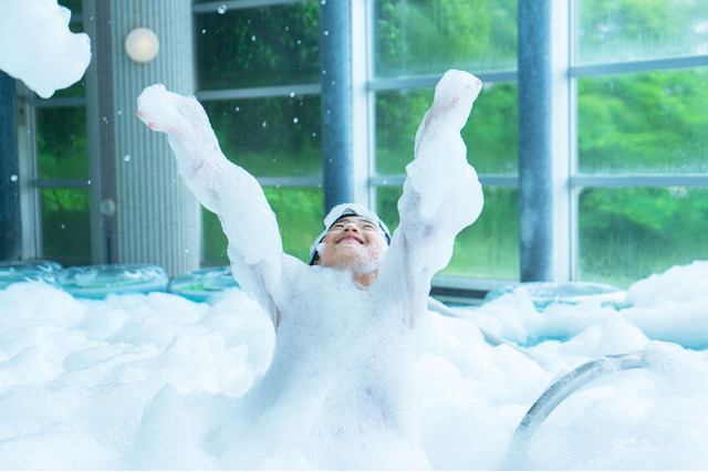 水着で入れるお風呂エリアで行う、大量の泡が噴き出すイベント。お風呂が泡で包まれて、まるで泡のプールのよう! お子さまはもちろん大人も一緒に楽しめる人気コンテンツです。泡に包まれながら写真を撮ったり、特別な時間をお楽しみいただけます。