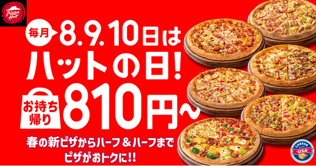 ピザハットでは、毎月8日・9日・10日を「ハットの日」として、毎月変わる対象商品をお持ち帰り810円~でご提供しています。また、「ハットの日」対象商品をご注文いただくと、さらにサイドメニューも特別価格でお楽しみいただけるという、とってもおトクな3日間です!