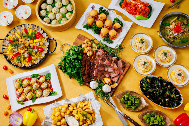 シーフードグリーンカレー(タイ)/小籠包(中国)/海老とイカのチリソース(中国)/ジャンボオムレツの牛肉の赤ワイン煮込みソース(フランス)/米沢牛とマッシュポテトのムサカ風グラタン(ギリシャ)/白身魚の香草パン粉焼き トマトとバジルのソース(イタリア)/チキンとアサリのパエリア(スペイン)/フィッシュ&チップス タルタル添え(イギリス)/ムール・ナチュール(ベルギー)/プルドポークのミニバーガー(アメリカ)