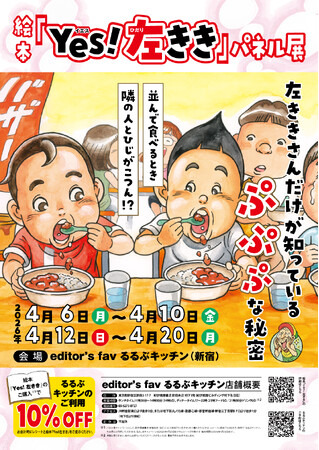 パネル展キャンペーンとして、紀伊國屋書店 新宿本店にて絵本『Yes!左きき』をご購入された方は、レシートと絵本『Yes!左きき』持参で、「るるぶキッチン」のご飲食代金が10%OFFになります。 なお、本キャンペーンは2026年4月20日までのレシートが対象です(有効期限は2026年4月26日まで)。 ※『るるぶキッチン』のお会計時にレシートと絵本『Yes!左きき』をご提示ください。物販商品は対象外です。