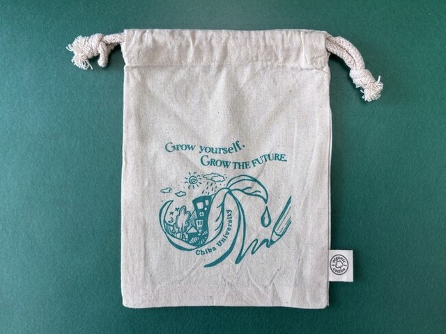 今年度は新入生にオーガニックコットンガゼット巾着をプレゼントしました。オーガニックコットンは、農薬や化学肥料を使わずに作られているため、環境負荷が少なく、農家の方の健康にも配慮しています。巾着のデザインは千葉大学法政経学部の2年生(当時)が担当し、新入生が成長していく過程でエコやSDGsに親近感を持ってほしいこと、自分たちの行動で持続可能な社会を作り上げていってほしいという願いが込められています。この巾着を新入生が大学在学中に限らず、卒業後も長く使用してくれると嬉しいです。