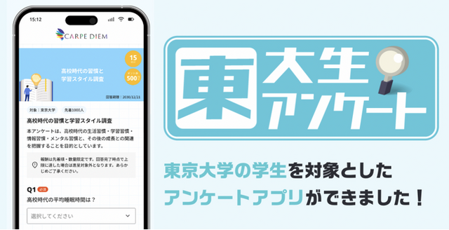 現役東大生を中心に教育支援事業等を行う株式会社カルペ・ディエム(代表者:西岡壱誠 所在地:東京都中央区)は、現役東大生を対象とした独自のアンケートアプリを開発しました。