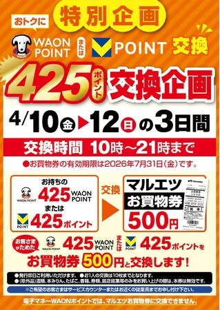 株式会社マルエツ(本社:東京都豊島区、代表取締役社長:本間 正治)は、4月10日(金)から4月12日(日)まで、お持ちのWAON POINTまたはV POINTがおトクにお買物券に交換できる企画を実施いたします。本企画では、マルエツ全店舗(魚悦糀谷店を除く)のサービスカウンターにて、お持ちの425WAON POINTもしくはV POINT425ポイントと、マルエツお買物券500円を交換いたします。毎月第2週に実施している交換条件(475ポイントで500円分)よりも、さらにおトクにご利用いただける企画です。この機会にWAON POINTとVPOINTをマルエツでご利用ください。