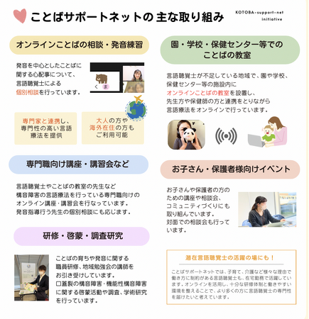 ことばや発音に悩む子どもや家族が、地域や年齢にかかわらず言語聴覚士などの専門家につながることのできる社会を目指し、相談支援、啓発資料の制作、講座・イベントの開催などを行っています。