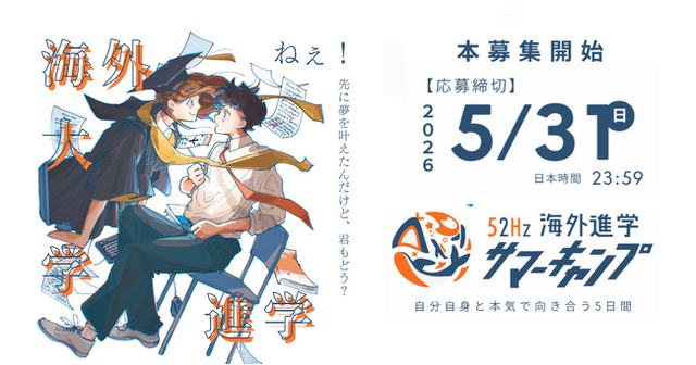 一般社団法人52Hz(本社:京都府、代表理事:梅澤凌我、以下52Hz)は、2026年7月27日(月)から31日(金)までの5日間開催する「52Hz海外進学サマーキャンプ2026」について、詳細を公開し、本日4月6日より本募集を開始いたしました 。